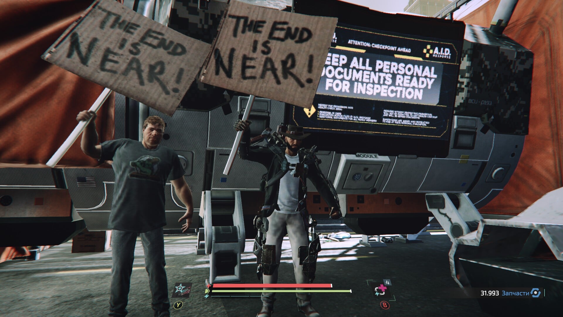 Большинство гражданских Джерико – из тех, что не успели эвакуироваться – собрались в мирных зонах, где игрок может спокойно пообщаться с NPC, закупиться ресурсами и взять побочные квесты. В диалогах персонажи, конечно, высказывают переживания о происходящем – но набирающий силы апокалипсис их зачастую волнует меньше, чем неуплаченный долг у ростовщика или желание достать красивый набор брони. Непонятно, какой тон хотели задать авторы – тут царит то ли апатия перед неизбежной кончиной мира, то ли банальный пофигизм.