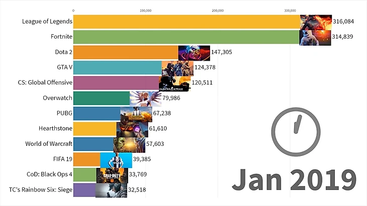 В январе 2019-го MOBA от Riot Games почти догнала Fortnite по количеству зрителей и даже смогла забраться на первое место. В это же время Dota 2 продолжала удерживать топ-3, а GTA 5 обогнала CS:GO. World of Warcraft сместился на девятое место.