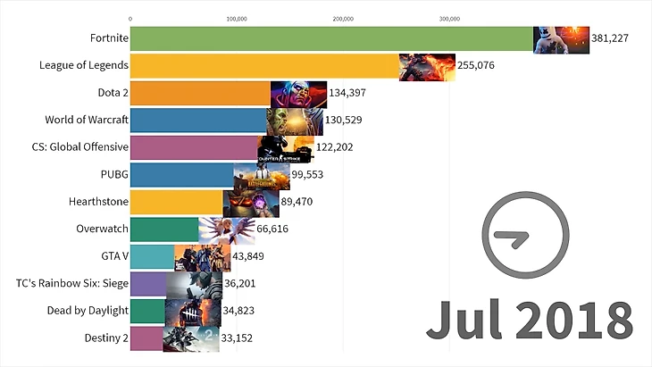 В июле 2018-го в топ-3 ворвался World of Warcraft. Fortnite все еще удерживал топ-1, и League of Legends никак не могла догнать его.