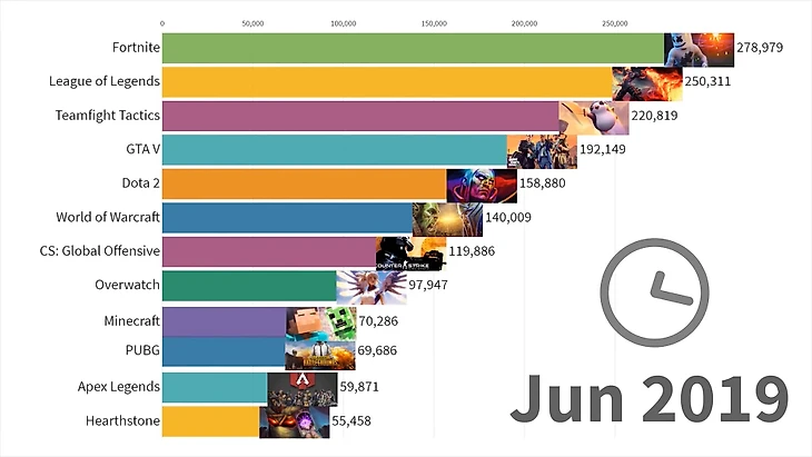 До июня Apex Legends находилась на почти самом дне таблицы, рядом с Hearthstone и PUBG. В тот же месяц в рейтинг ворвалась Teamfight Tactics, аналог Dota Auto Chess – она заняла третье место.