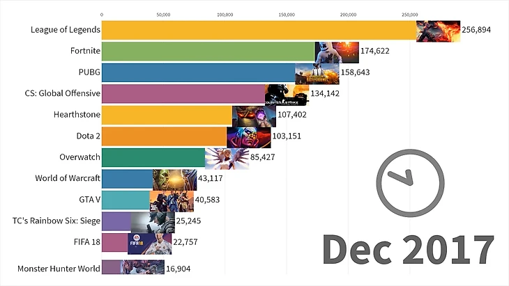 Fortnite набирала популярность почти сразу своего релиза в июле 2017 года, и уже к декабрю сместила PUBG со второго места.