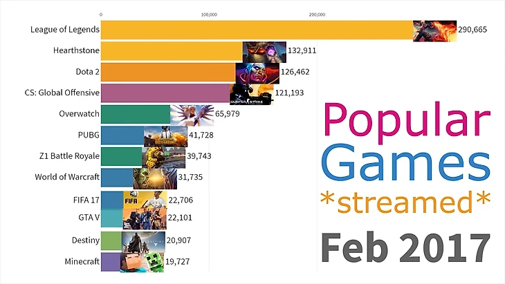 С августа 2015-го до февраля 2017 года в топе удерживалась League of Legends – она стабильно обгоняла ближайшего преследователя на 100 тысяч зрителей. За второе, третье и четвертое место боролись Dota 2, Counter-Strike: Global Offensive и Hearthstone.