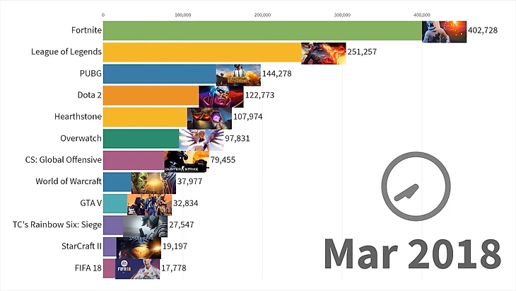 В январе 2018-го королевская битва от Epic Games обставила League of Legends и стала безоговорочным лидером, а к марту поставила рекорд в 400 тысяч одновременных зрителей.