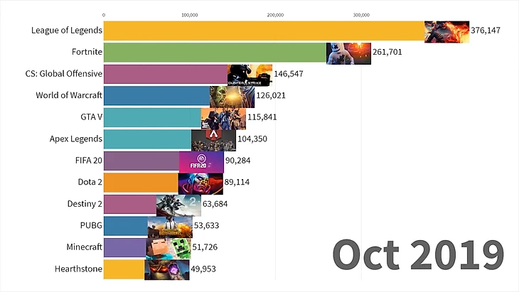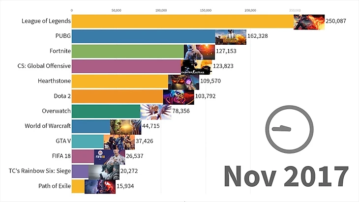 На YouTube-канале Data is Beautiful появилось видео с анимированным графиком самых популярных игр на Twitch. Автор начал вести отчет с августа 2015 года.