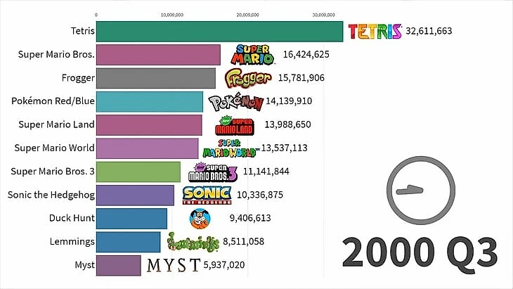 YouTube-канал Data is Beautiful опубликовал видео с анимированным графиком продаж крупнейших видеоигр в истории. В видео показан промежуток c 1989 по 2019 год, разбитый по финансовым кварталам – но продажи указываются не поквартально, а за все время. Тем удивительнее, что итоговую тройку лидеров составили исключительно современные хиты.