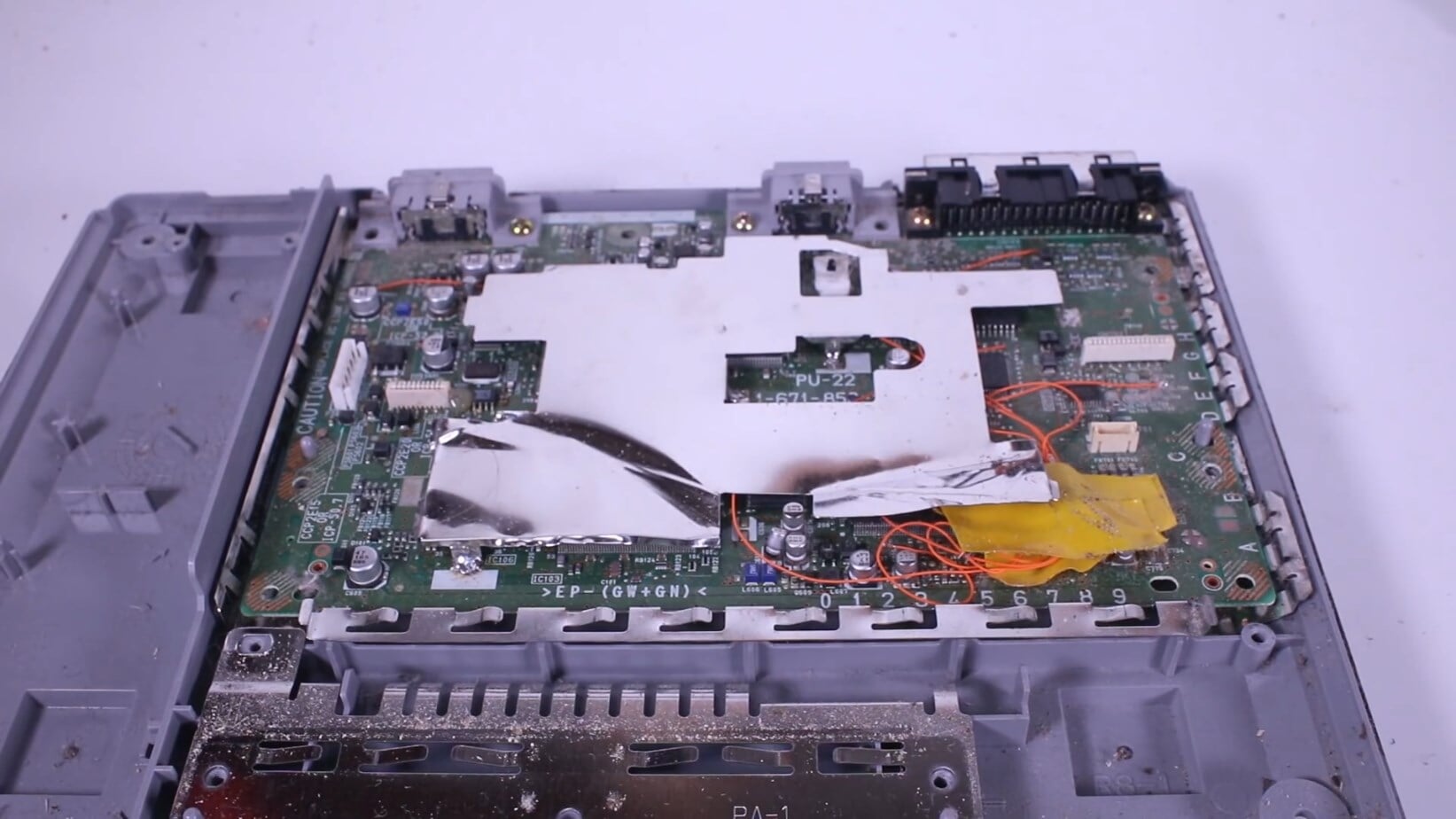 Еще одно наблюдение: в консоль был установлен пиратский чип-мод для запуска нелицензионных дисков и игр других регионов. Поскольку это не редкость для использованных PlayStation, автора удивило другое: при установке чипа кто-то очень сильно погнул металлический кожух, хотя в этом не было никакой нужды.