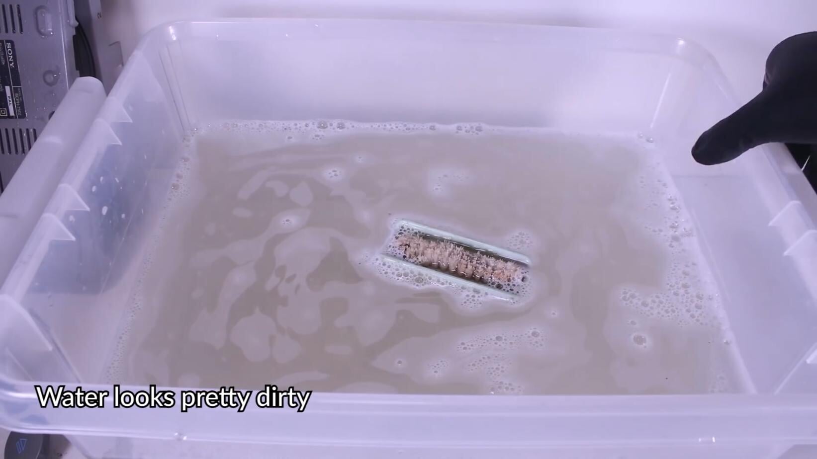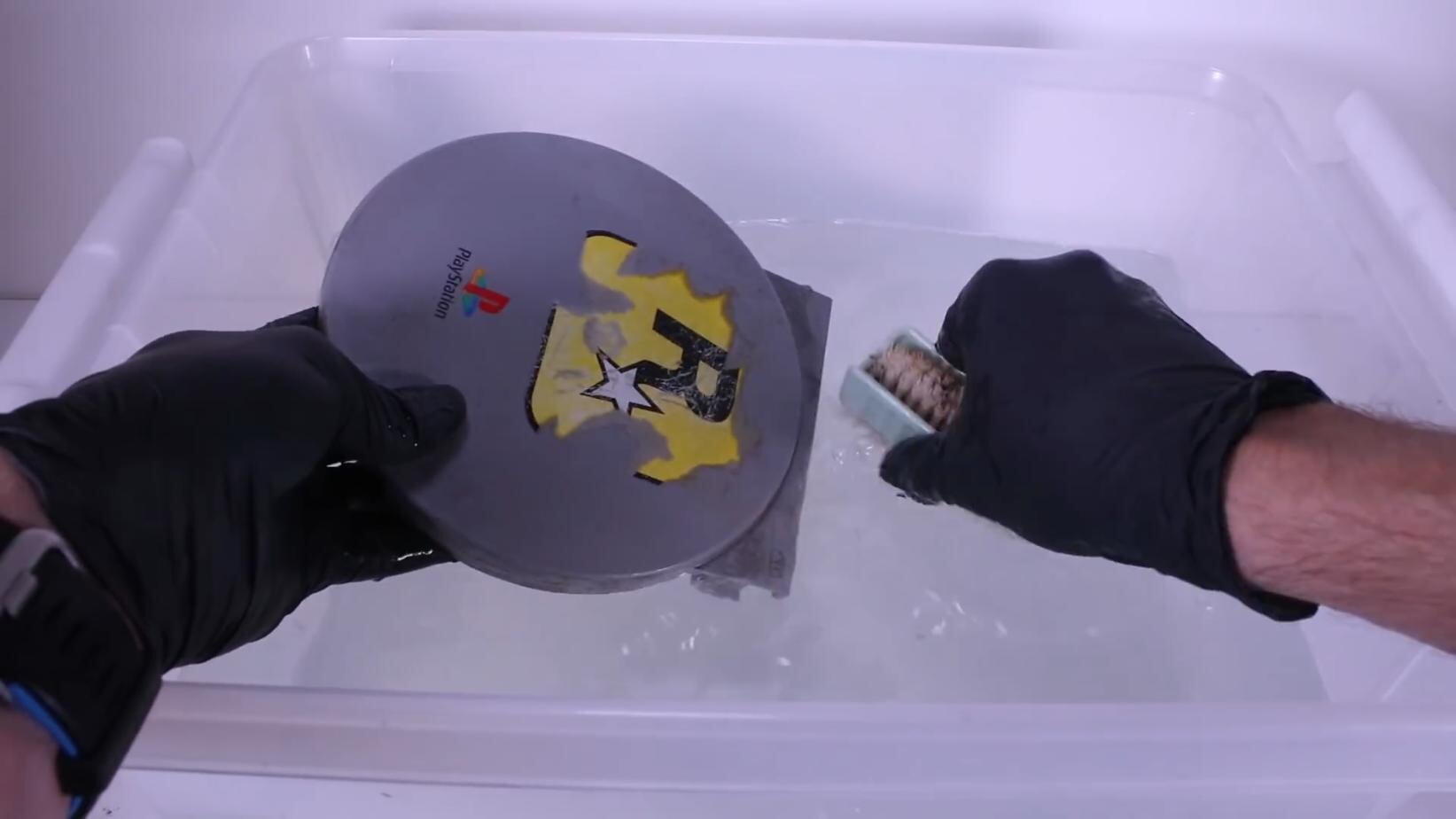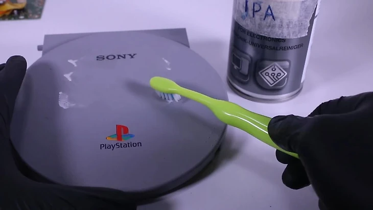 После того как консоль была полностью разобрана, автор очистил все пластмассовые детали корпуса в ванночке с мыльным раствором. Для этого он использовал щетку.