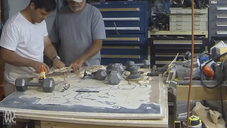 Следующие несколько дней автор вместе с помощниками послойно размещал элементы карты в нужных местах, фиксируя их клеем. Процесс вышел очень сложным: нижние слои фиксировались не только клеем, но и гвоздями, которых скрыли верхними элементами. Эти действия пришлось повторить около 150 раз – отдельно для каждой секции.