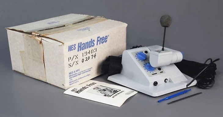 С Nintendo же связана совсем древняя история. Ещё во времена NES был представлен Hands Free Controller. По задумке, он крепился на тело игрока, а управление осуществлялось ртом. Язык отвечал за направление, посасывание имитировало нажатие на кнопку А, а чтобы сымитировать кнопку В нужно было подуть. В открытой продаже этого контроллера не было, но можно было заказать, обратившись напрямую в Nintendo