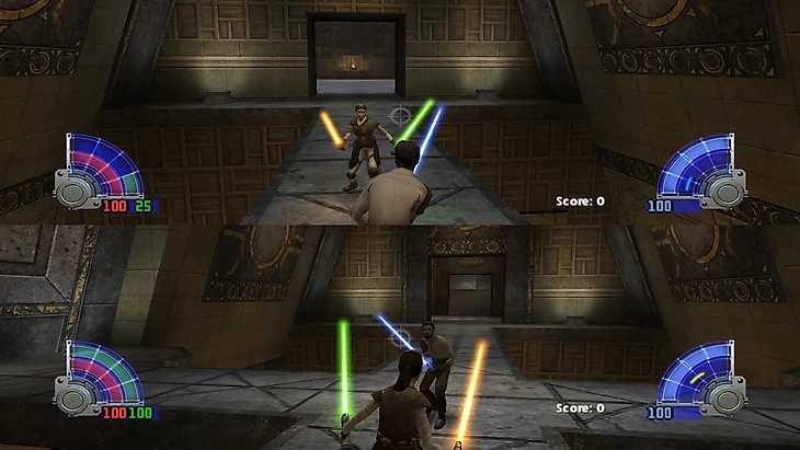 Со стороны кажется, что все поединки сводятся к банальному закликиванию врагов. Честно говоря, это не так уж и далеко от истины – необходимо делать скидку на время. Нас не заставляют проявлять невероятную джедайскую реакцию, чтобы отражать выстрелы бластеров, блокировка атак чужих световых мечей производится автоматически, а сами бои с другими пользователями Силы напоминают вакханалию спецэффектов из плохоньких боевиков с вышедшими в тираж звездами прошлого. Но это только на первый взгляд. Темные джедаи не стесняются использовать весь свой арсенал: ребята охотно демонстрируют свои акробатические навыки, стараясь избежать вашей атаки; применяют излюбленное адептами Темной стороны Силы удушение и вообще частенько стараются лишить вас жизненных сил другими своими способностями.