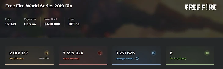 16 ноября в Рио-де-Жанейро прошел чемпионат мира Free Fire World Series 2019 Rio с призовым фондом 400 тысяч долларов. По статистике Esports Charts, первый же раунд финала в пике смотрели 2,016,157 человек.