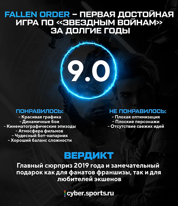 Star Wars Jedi: Fallen Order – великолепная игра. Отдельные ее элементы вряд ли потягаются с другими представителями жанра, но вместе они образуют цельную мозаику и превращают игру в увлекательный аттракцион даже для тех, кто скептически относится к «Звездным войнам». Fallen Order уж точно одна из лучших игр про «Звездные войны» за последние лет 10-15 и один из главных сюрпризов 2019 года. Надеюсь, что сиквел не придется ждать столько же. Тем более, что добро на него уже дали.