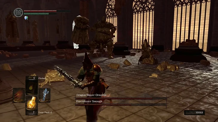 Смауг орудует огромным молотом, но медлителен, а Орнштейн – наоборот, очень быстрый и умеет кидаться молниями, а сражается копьем. Вся сложность битвы заключается в том, что парочка практически не отходит друг от друга, и если игрок наткнется на удар хотя бы одного из них, то второй подключится почти моментально. Это делает битву сложным испытанием даже для истинных хардкорщиков.