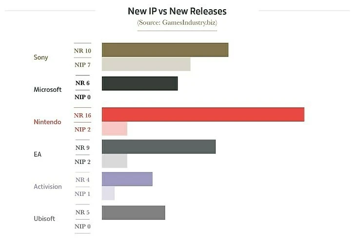 Хуже всех в году выступили Microsoft, Activision и Ubisoft. Первая выпустила шесть игр и не придумывала новых IP. Вторая создала четыре игры и одну новую франшизу, а третья сделала пять игр (все – по старым франшизам). Крепким середнячком оказалась Electronic Arts – девять игр и две франшизы.