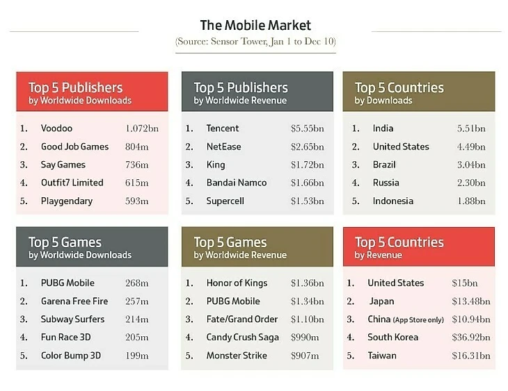 Мобильный рынок продолжает приносить бешеные деньги. В пятерку лучших игр по прибыли вошли Honor of Kings ($1,36 млрд), PUBG Mobile ($1,34 млрд), Fate/Grand Order ($1,1 млрд), Candy Crush Saga ($990 млн) и Monster Strike ($907 млн).