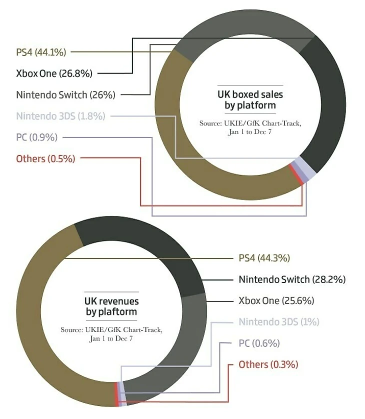 Лидирующие позиции по количеству проданных игр и общей прибыли занимает PlayStation 4 от Sony. Xbox One от Microsoft заняла второе место по количеству реализованных игр в рознице и третье по количеству прибыли. А Nintendo Switch – наоборот, третье место по количеству проданных картриджей и второе по выручке. Компьютеры в обоих случаях заняли пятое место – они уступили даже старенькой Nintendo 3DS.