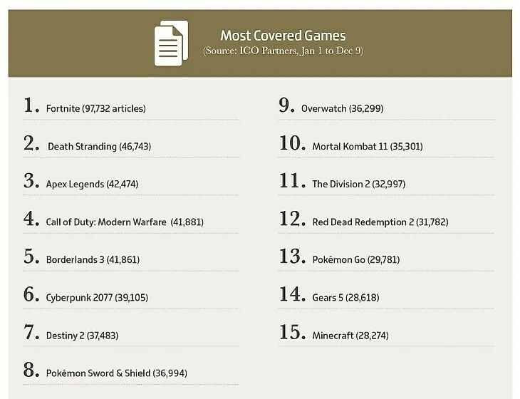 Самой популярной игрой для журналистов в 2019 году оказалась Fortnite – про нее суммарно написали свыше 97 тысяч статей и заметок. На втором месте идет Death Stranding от Хидэо Кодзимы (46 тысяч), на третьем – Apex Legends (42 тысячи).