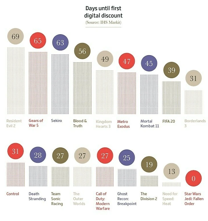 А вот хуже всех в этом плане выступила Star Wars Jedi: Fallen Order – на нее сделали скидку в первый же день. Далее идет NFS Heat (13 дней) и The Division 2 (19 дней).
