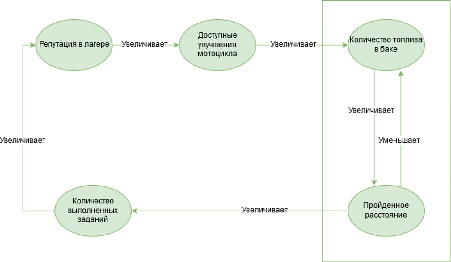 Выделенный контур является потребителем улучшенного бака мотоцикла. В то же время он влияет на то, как скоро игрок сможет купить новое улучшение. Частое повторение процесса дозаправки является внешней мотивацией к тому, чтобы переключиться с выполнения заданий и исследования мира на покупку улучшения.