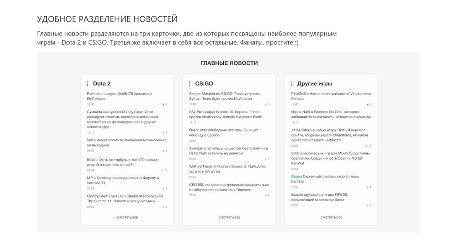 2. Хотелось просто сделать разделение, чтобы глаз падал именно на интересующие новости, а не копался в этой солянке. (Зачем мне читать заголовки новостей про КС, если я только доту смотрю?)