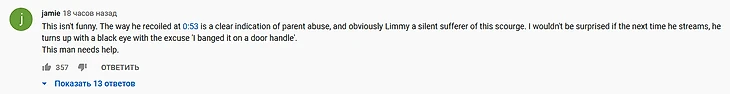 «Это не смешно. То, как он отскочил [когда сын ворвался в комнату] – явный признак эксплуатации старшего поколения, и очевидно, что Limmy молча это терпит. [Sports.ru: существует термин elder abuse («эксплуатация старшего поколения». Например, в этом обвинили менеджера легенды комикс-индустрии Стэна Ли. Согласно иску, он мешал пожилому Ли видеться с родными и врачами, а также похитил до 5 миллионов долларов]. Я бы не удивился, если в следующий раз он появится на стриме с фингалом и скажет «Я ударился об дверную ручку». Этому человеку нужна помощь».