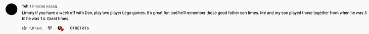 «Лимми, если возьмешь недельный отгул, поиграй с Дэнни в LEGO-игры на двоих. Они очень веселые, да и он запомнит хорошо проведенное время с отцом. Я играл в них со своим сыном, когда ему было с 5 до 14 лет. Было здорово».