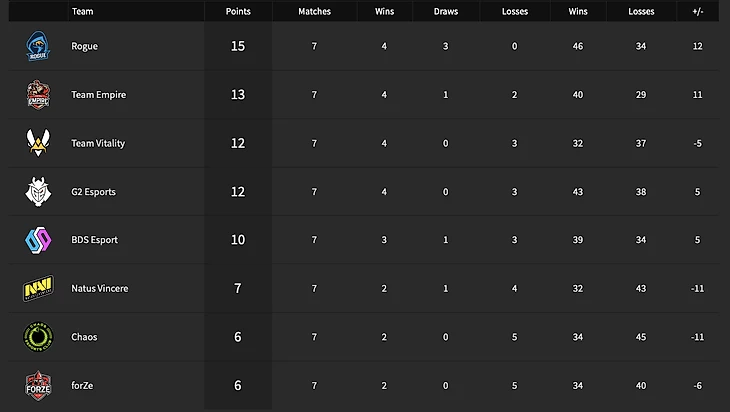 Наибольшая разница выигранных/проигранных раундов – Rogue (+12)
