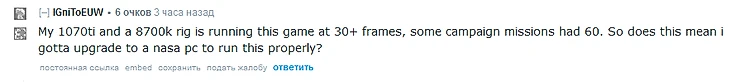 «Мой комп с 1070ti и 8700k запускает эту игру при 30+ FPS, а в некоторых миссиях кампании цифра увеличивается до 60. Значит ли это, что мне нужно обновиться до компьютера NASA, чтобы нормально поиграть?»