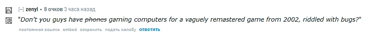 «У вас что, нет ̶т̶е̶л̶е̶ф̶о̶н̶о̶в̶ игровых компьютеров для едва обновленной игры из 2002 года, полной багов?» (это отсылка к мемной фразе «У вас что, нет телефонов?». Ее произнес старший дизайнер мобильной Diablo Immortal после негативной реакции зала на анонс игры).