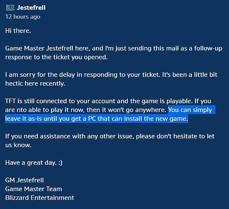Перед этим другие сотрудники компании попытались объяснить ему, почему в лаунчере его копия Warcraft 3: The Frozen Throne превратилась в Warcraft 3: Reforged. После еще нескольких ответов от игрока и угрозы пожаловаться в службу защиты потребителей, Blizzard наконец ответила на изначальный запрос: оказалось, что его копия Warcraft 3 была приобретена в стороннем магазине, а потому не может быть компенсирована издателем.