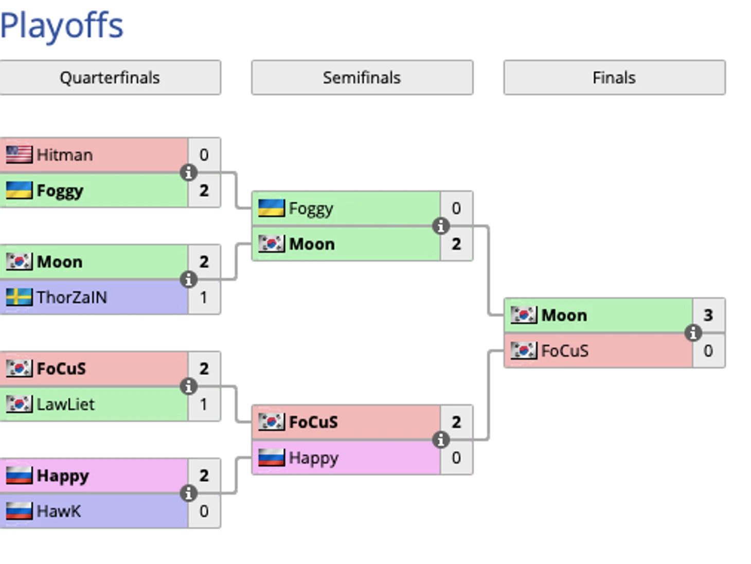 Победный путь СНГ-игроков оборвался на полуфиналах. Foggy играл зеркальный матч с лучшим ночным эльфом в истории Warcraft 3 Moon, а Happy, на которого изначально возлагалось больше надежд, проиграл орку. Нежить всегда тяжело играла против орков, а тут еще и FoCuS отыграл неплохо. В итоге мы получили корейский финал, где Moon оказался сильнее соотечественника.