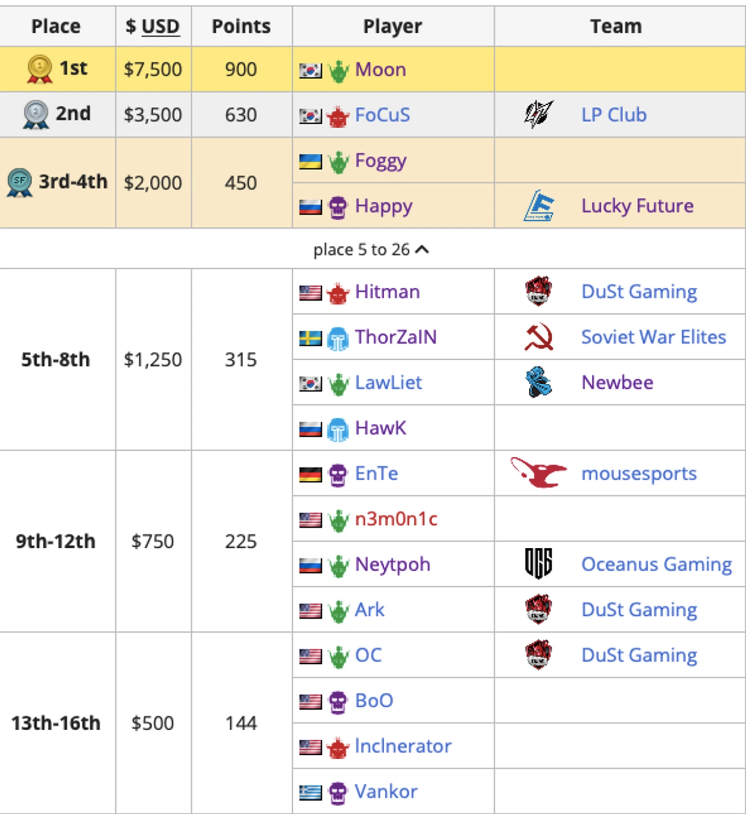 Обратите внимание, что на Liquidpedia игроки за разные расы подсвечены разными цветами. Зеленый – это ночные эльфы, фиолетовый – нежить, синий – это люди, а розовый обозначает орков.