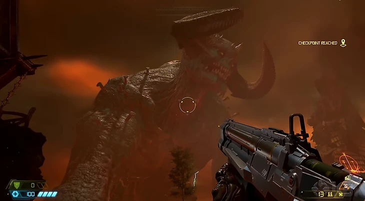 Как только координаты получены, Палач отправляется прямо в пекло. Игроку сразу дают дробовик – слабеньким пистолетам в Eternal место не нашлось. Начинается мясорубка, во время которой вас быстро учат добивать врагов, распиливать их бензопилой и устанавливать модификации. Показывают и расширенную акробатику: двойные прыжки и возможность раскачиваться на специальных балках.
