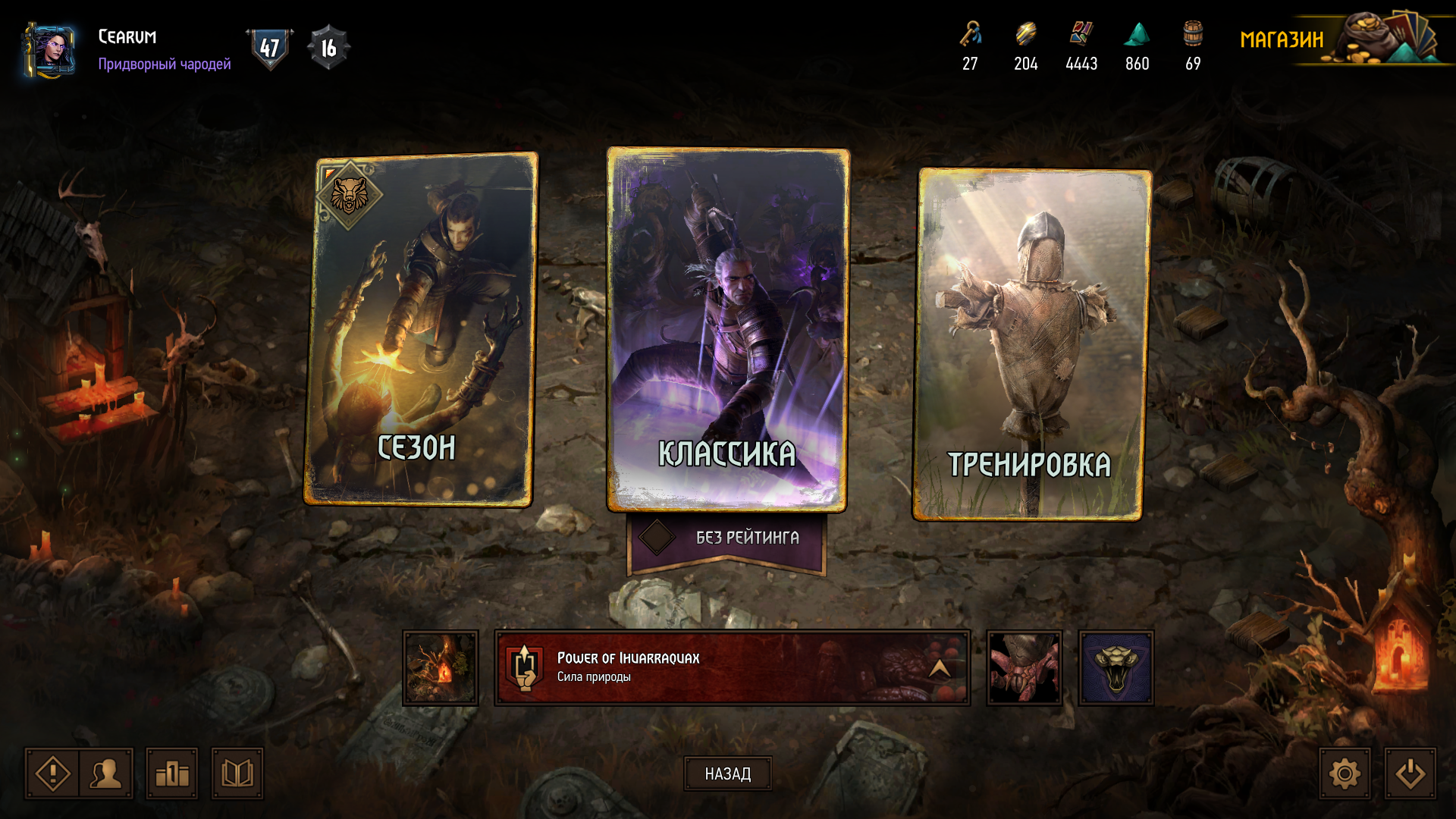 Другой важный режим – сезон. Это развлекательный режим с особыми правилами, меняющимися каждый месяц. Обычно для него требуются специально созданные колоды. Например, прямо сейчас активен сезон Медведя: обоим игрокам предстоит играть с удаленной после замены карт колодой до выявления победителя.