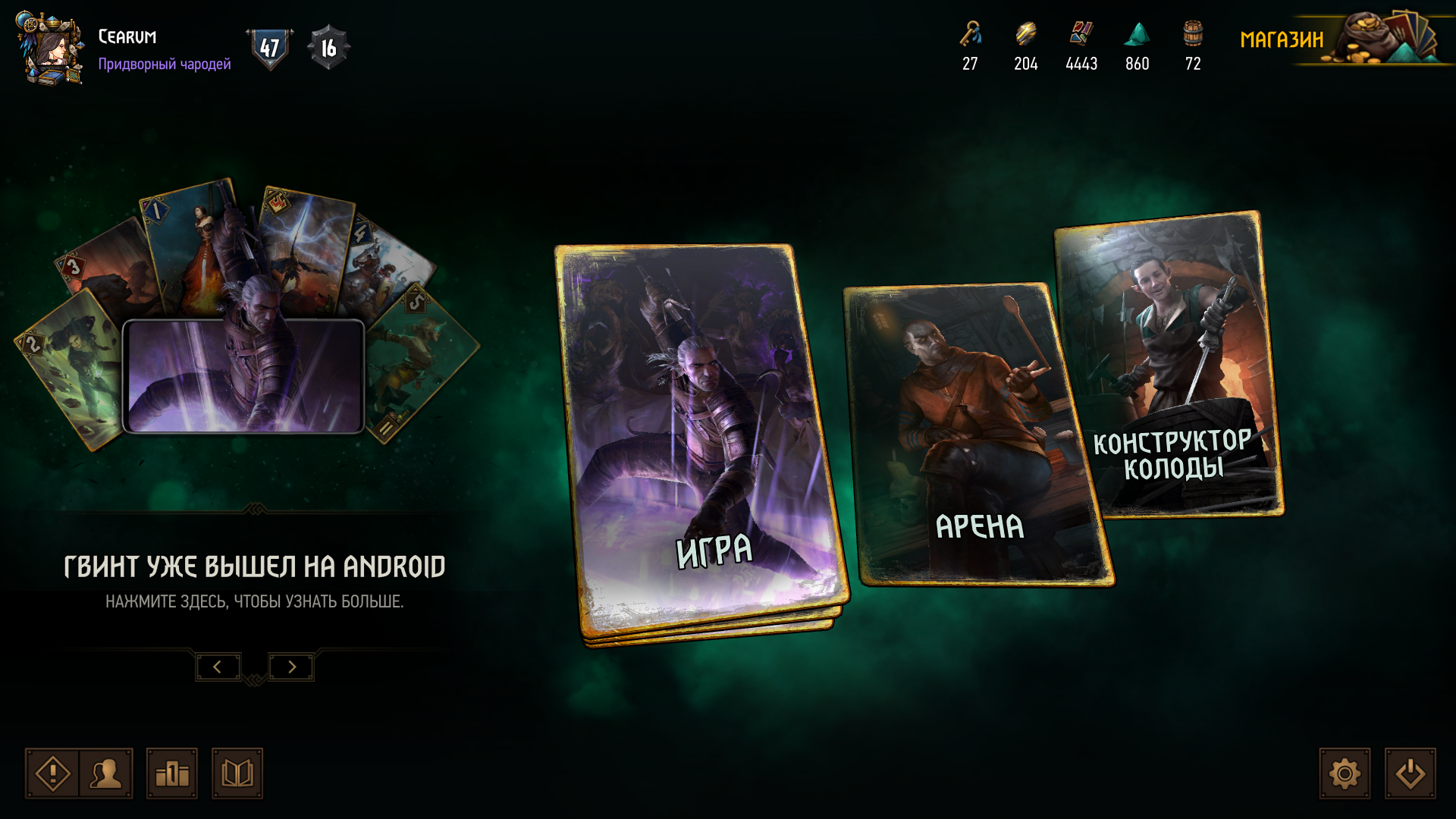 Первое, что видит игрок, заходящий в Гвинт – это его интерфейс. Он всегда был прост и разделен лишь на несколько пунктов. В виде крупных карточек выделены «игра», «Арена», и «конструктор колоды». Ниже мы рассмотрим эти пункты более подробно.