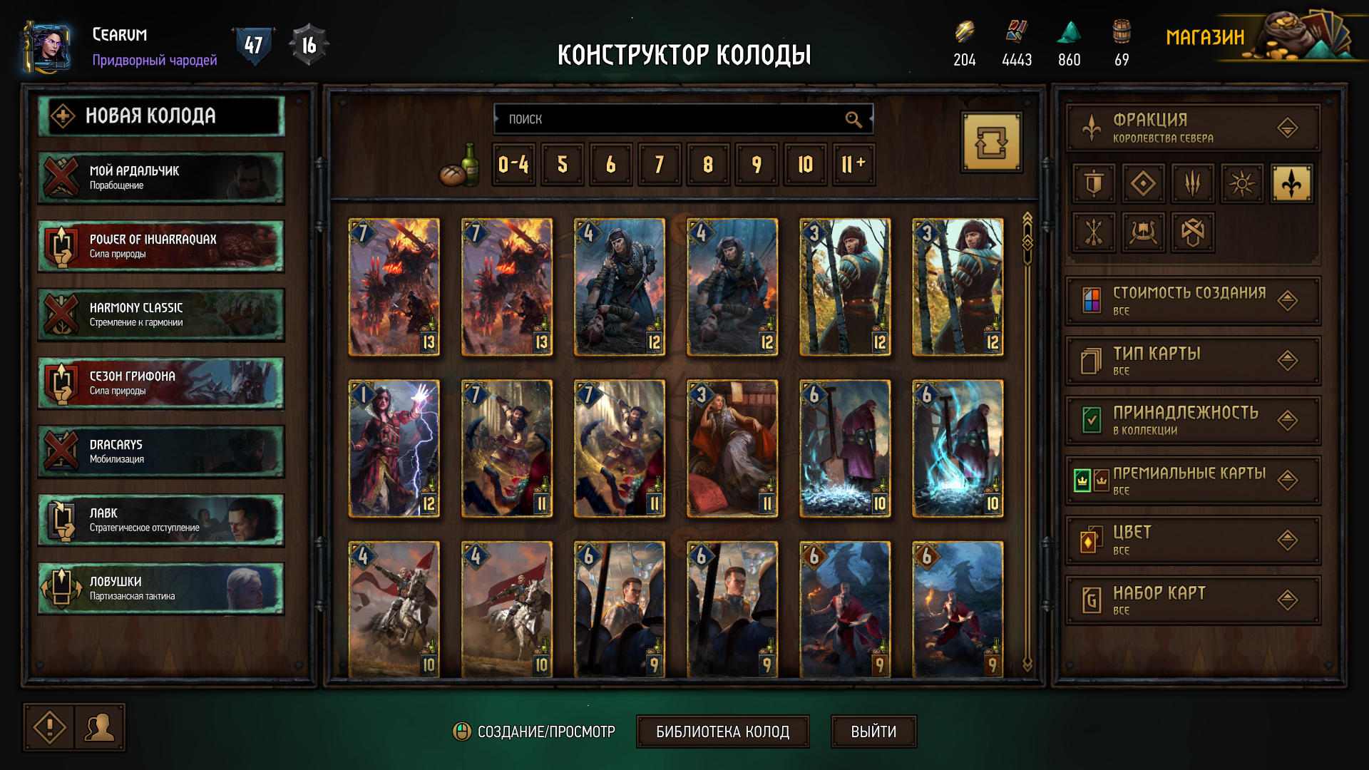 В конструкторе колод вашему вниманию предстают список колод и вся коллекция карт, полученных в результате игрового прогресса. Есть множество фильтров, ключевым из которых, вероятно, станет фильтр по фракциям (он также включается при создании колоды, но в список добавляются нейтральный карты). Анимационные версии карт можно отключить и добавлять в колоду по мере их появления.