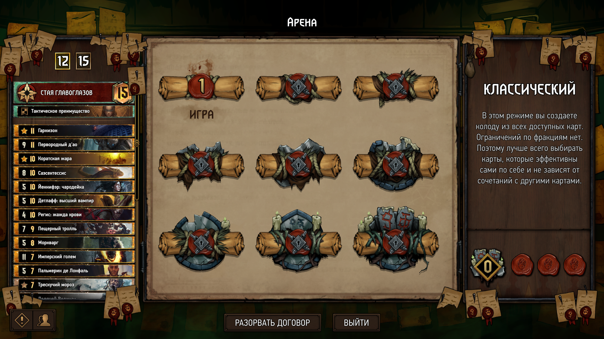 Открывая вкладку «игра», мы видим различные режимы игры. Основным считается классическая партия (стоит поставить галочку в пункте «без рейтинга», пока не освоитесь в игре!). Она представляет собой обычную партию в Гвинт: нужно выиграть 2 раунда из 3 по очкам. В наличии игроков есть 10 карт (с добавлением 3 в каждом новом раунде при незаполненности «руки»).
