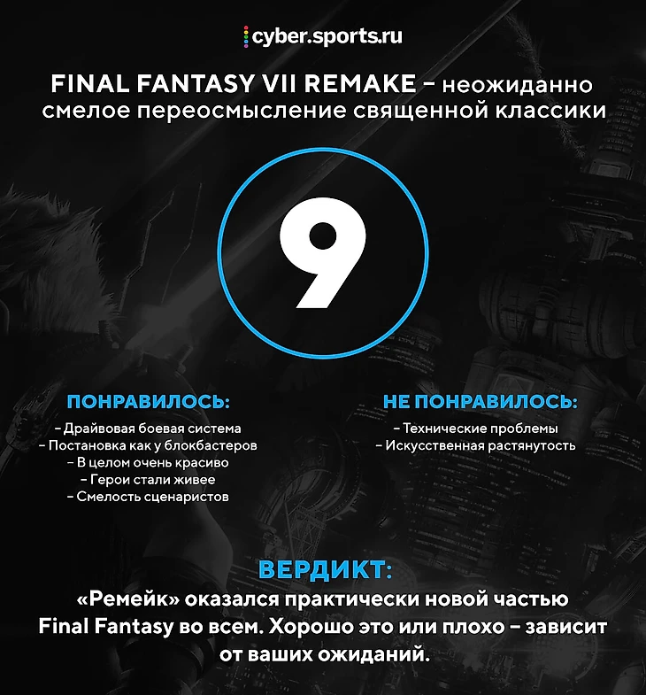 Таким образом Square Enix сделала «ремейк» одинаково интересными как для тех, кто давно прошел Final Fantasy VII, так и для новой аудитории, но при этом оскорбиться решениями сценаристов могут и те, и те. Мне же просто интересно, насколько следующая игра сойдет со старых рельс, а еще только, сколько лет пройдет до выхода полного сборника Remake.