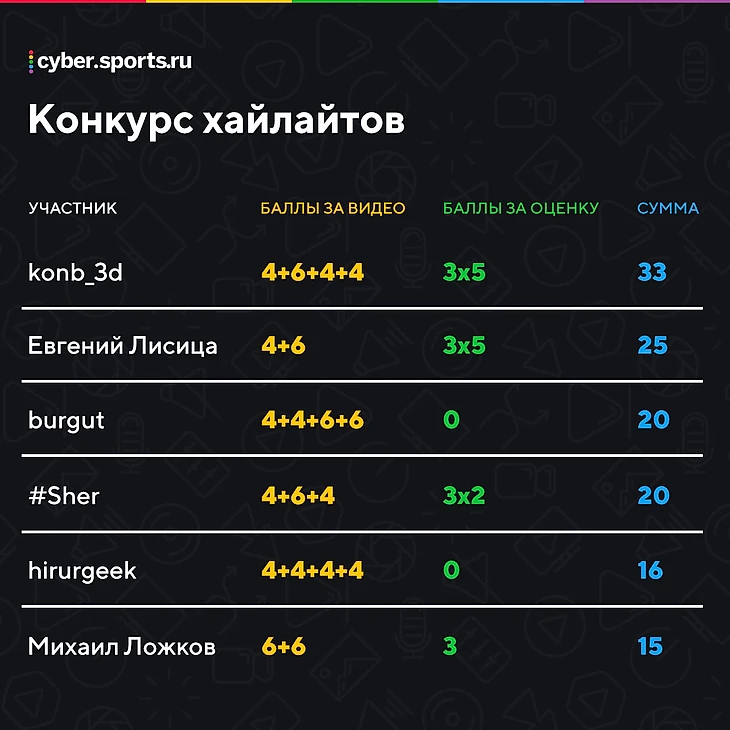 Прошло 11 дней со старта конкурса хайлайтов. Напоминаем, что конкурс завершится 18 мая, в 23:59. Посмотрим, сколько баллов набрали участники!