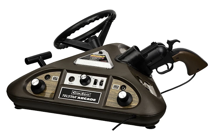 Тем не менее компания Coleco Telstar, выпускавшая аппаратные клоны систем Pong и Atari, выпустила оригинальную консоль, настоящее произведение искусства. В корпус Arcade, помимо прочего, встроен руль и держатель для лазерной пушки, так что докупать аксессуары не придется. При этом сама приставка выполнена в виде треугольника, и даже картриджи для нее были треугольными.
