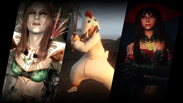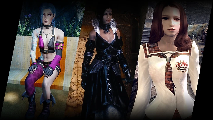 Кажется, на этом сайте больше дотеров, чем лолеров, но даже первые оценят костюм Джинкс из Лиги. На вопрос «зачем вообще добавлять ее в Скайрим?» автор отвечает просто: «потому что могу!». По центру – ослепленная Радовидом чародейка Филиппа Эйльхарт. Теперь ее роскошный наряд можно примерить. Справа – школьная форма. Драконорожденная, напоминающая Алину Загитову, не в комплекте.