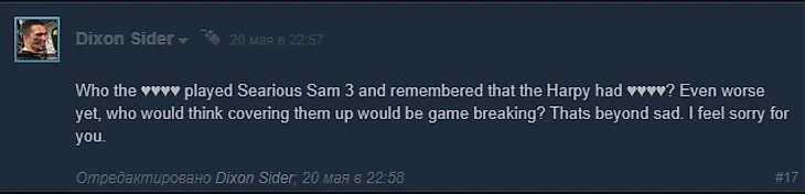 «Кто ##### вообще играл в Serious Sam 3 и запомнил, что у гарпии оголена грудь? Даже хуже, кто подумал бы, что их так важно прикрыть? Это печально. Я тебе соболезную».