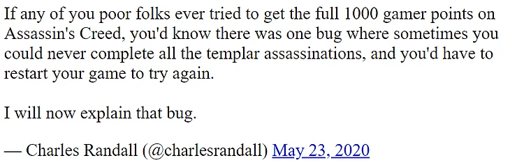 Сегодня в твиттере Чарльз Рэндалл — программист первой части Assassin’s Creed, — рассказал историю введения в игру побочных миссий. Оказалось, что незадолго до отправки игры в продажу, ребенок исполнительного директора Ubisoft Ива Гиймо поиграл в нее и заявил об отсутствии каких-либо интересных занятий кроме прохождения сюжетной линии.