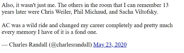 Этот опыт и имена тех сотрудников, которые помогли ему решить эту проблему, Чарльз Рэндалл помнит даже спустя 13 лет. В работе ему помогли Крис Вейлер, Фил Мишо и Саша Вилтовски.