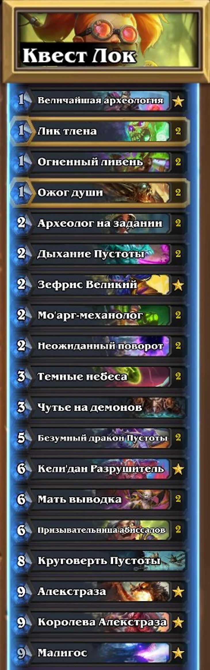 Колода очень мощная, но и создана не на основе какого-нибудь комбо, а за счет большого количества сильных карт, чаще всего легендарок. Поэтому и стоимость соответствующая — 14380 пыли за колоду. Подумайте несколько раз, прежде чем начинать крафтить.
