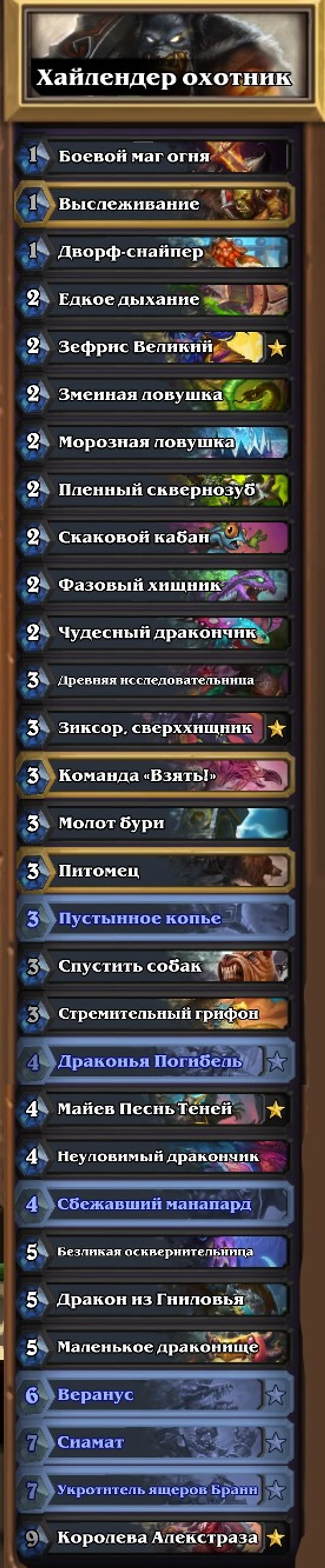 Хайлендер-Охотник занимает первую позицию в рейтинге Hsreplay.net. За счет чего эта колода настолько сильна? Хант этой сборки имеет большое количество хороших опций. Всегда работающий Зефрис может помочь усилить агрессию или наоборот зачистить стол противника. «Пленный сквернозуб» за 2 маны — хорошая поддержка агрессии.