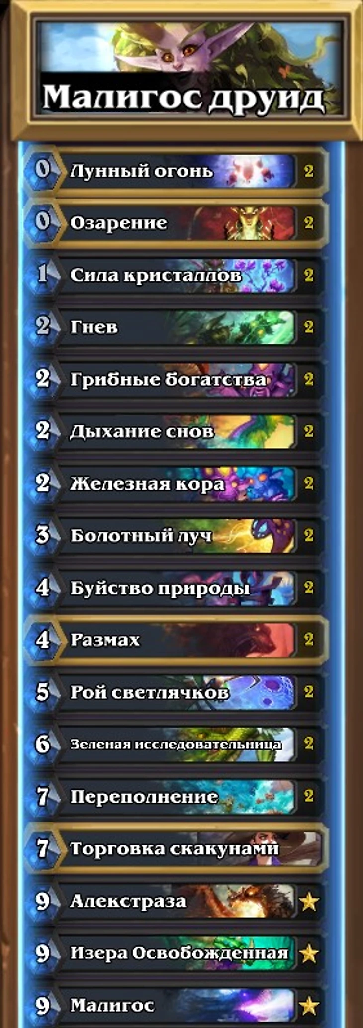 Если вы фанат Биг-Друида, то это колода вам полностью подойдет. Признаюсь, это одна из первых колод дополнения, от которой я долго не мог оторваться. Изначально Друид игрался только в качестве токен-архетипа и был довольно скучноватым. Несколько недель назад игроки начали впервые пробовать Спелл Друида, хотя я бы его назвал скорее Миракл Друидом.