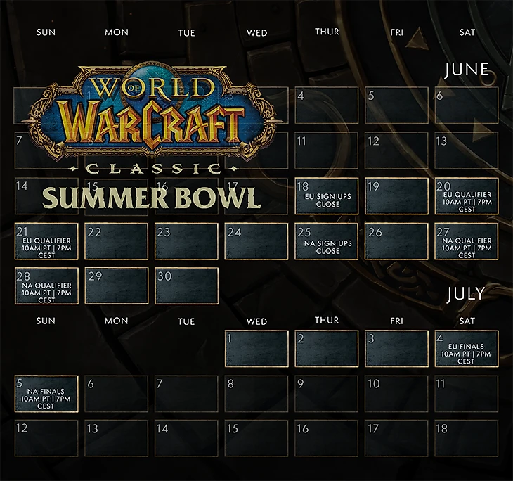 Шесть лучших команд из Северной Америки и Европы смогут сразиться за свою долю одного из двух раздельных призовых фондов по 4000 $ в каждом регионе, а также возможность прославиться благодаря победе на турнире WoW Classic Summer Bowl!