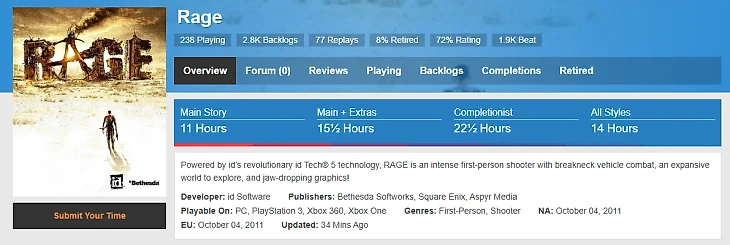 Несмотря на все это, я считаю Rage хорошей игрой. Основные проблемы случились с портом на ПК. Если не брать это во внимание – игра очень красива для своего года выхода. Стрельба тут отменная (что еще ожидать от создателей Doom, Quake и Wolfenstein), а саундтрек атмосферный. Короче, Rage – отличное развлечение на пару-тройку вечеров. Прохождение займет у вас 10-11 часов.