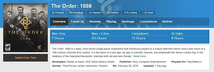 На прохождение игры уходит порядка 7 часов. За это игра получила львиную дозу критики и низкие оценки от игроков и прессы. Кто-то называл игру клоном Gears of War и заявлял, что игра не привносит ничего нового в жанр. Игроки ругали The Order: 1886 за отсутствие мультиплеера – покупать за полную цену игру с сюжеткой на несколько часов казалось не очень хорошей идеей.
